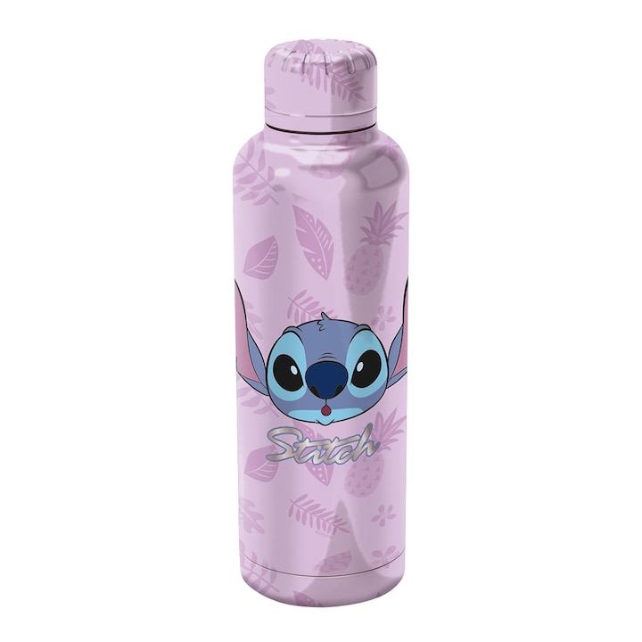 Botella de agua reutilizable térmica decorada con un divertido dibujo del personaje animado Stitch sobre un fondo tropical de color lila.