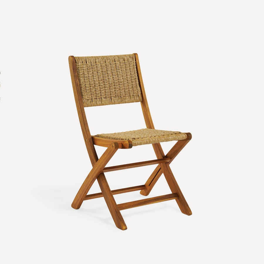 Silla plegable con estructura de madera de acacia y asiento y respaldo de multifibra, un material resistente, flexible y de fácil mantenimiento.