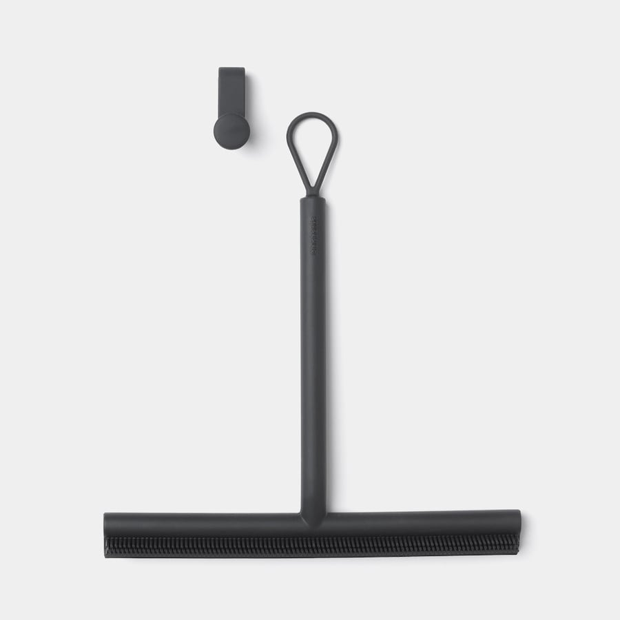 Espátula limpiacristales de silicona. Dispone de un cepillo en uno de los lados y de una goma en el otro para limpiar las paredes de la ducha y azulejos.