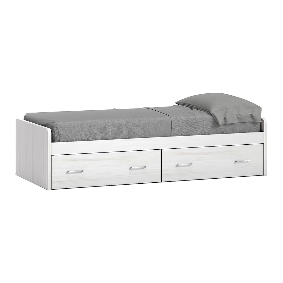 Cama individual fabricada en melamina que, además, te ofrece un espacio extra de almacenaje gracias a los dos cajones inferiores que se extraen con un sistema de ruedas.