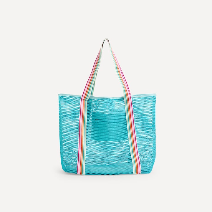 Bolsa de playa con diseño de rejilla y asas largas de colores. Cuenta con bolsillo interior con cremallera.
