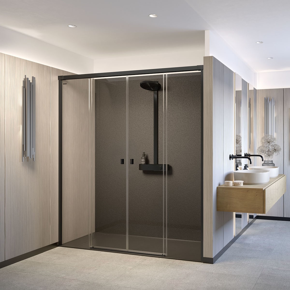 Mampara ducha frontal 2 puertas correderas y 2 panel fijos.