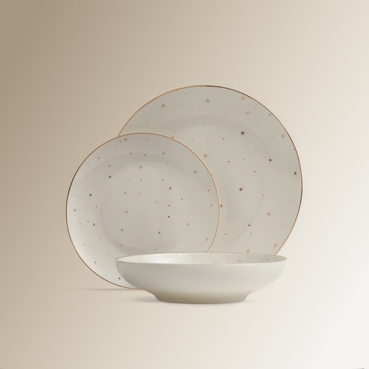 Vajilla por piezas de la colección Estrellas, decorado con estrellas doradas ideal para tus fiestas y celebraciones con un toque de elegancia.