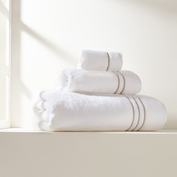 La toalla de tocador tiene una línea bordada, la de lavabo tiene dos líneas bordadas y la de baño tiene tres líneas bordadas.