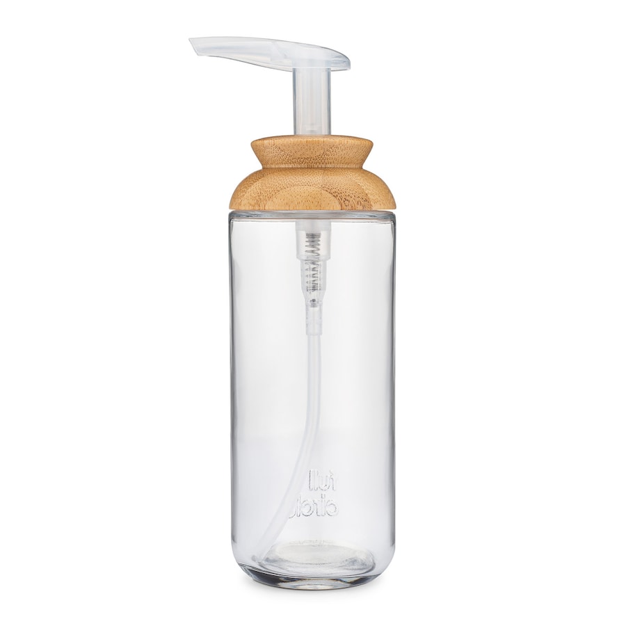 Dispensador de jabón de diseño moderno, realizado con tapa de bambú y vidrio reciclado. Un elemento funcional que dará estilo a tu baño.
