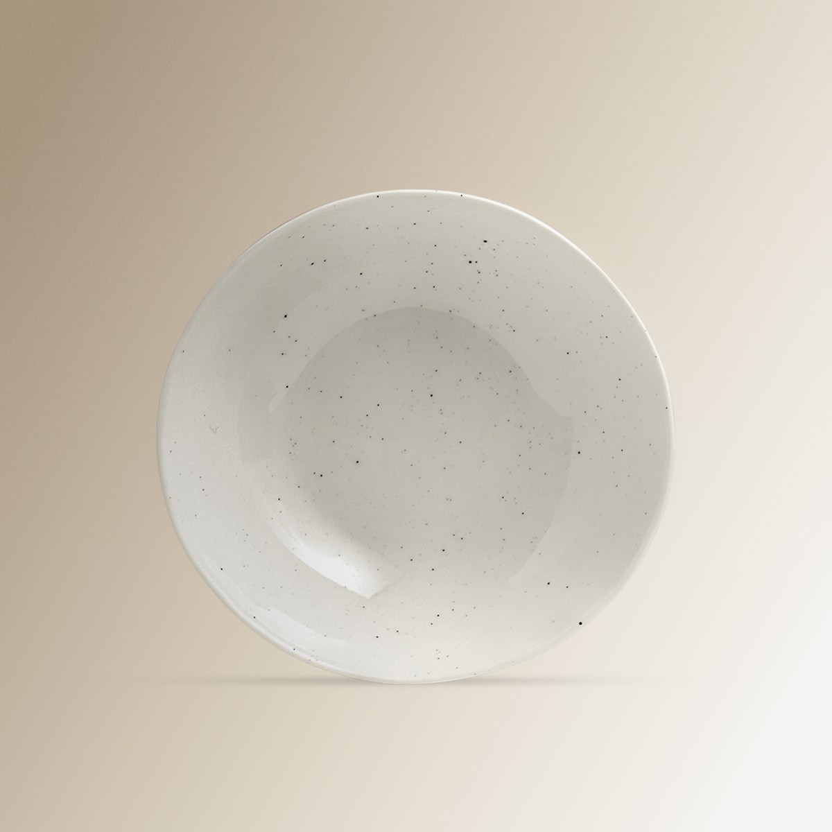 Plato hondo de la serie Yona de nuestra marca Room - El Corte Inglés. Un estilo elegante y tradicional, fabricado en porcelana blanca moteada perfecta para vestir tu mesa en todas las ocasiones. La porcelana es un material muy resistente, apto para el lavavajillas.