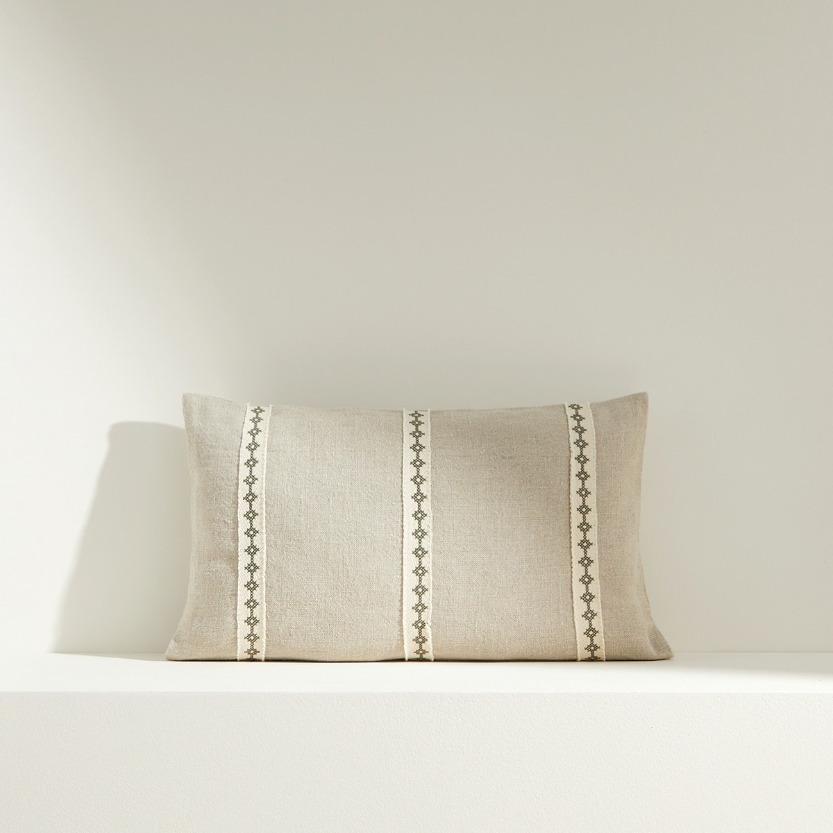 Cojín decorativo de diseño liso con cenefas geométricas.