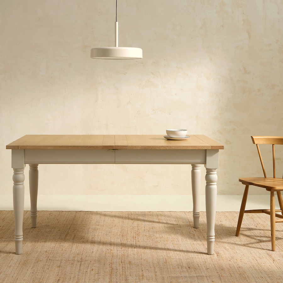 Mesa de la serie New England de un diseño clásico, con un tablero de chapa de roble y patas fabricadas en madera maciza de haya y lacadas en un tono crema. El acabado del tablero le da a la mesa un aire rústico. Incluye 2 extensibles que quedan ocultos bajo el tablero. Cada extensible mide 40 cm y puedes poner uno solo o los dos.