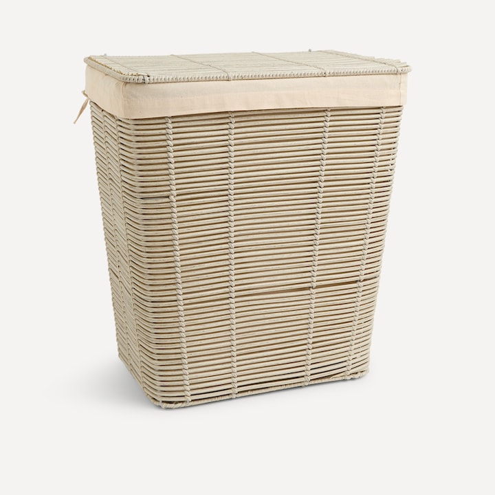 Cesto con tapa para guardar la ropa para la colada muy práctico y cómodo para mantener el orden a diario. Está fabricado en poliratán, un material plástico que imita las fibras naturales con la ventaja de que tiene una gran resistencia, soporta perfectamente la humedad y se puede lavar. Además, tiene un aspecto muy natural.