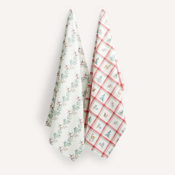 Set de 2 paños de cocina de sarga con diseño de cuadros y motivos navideños.