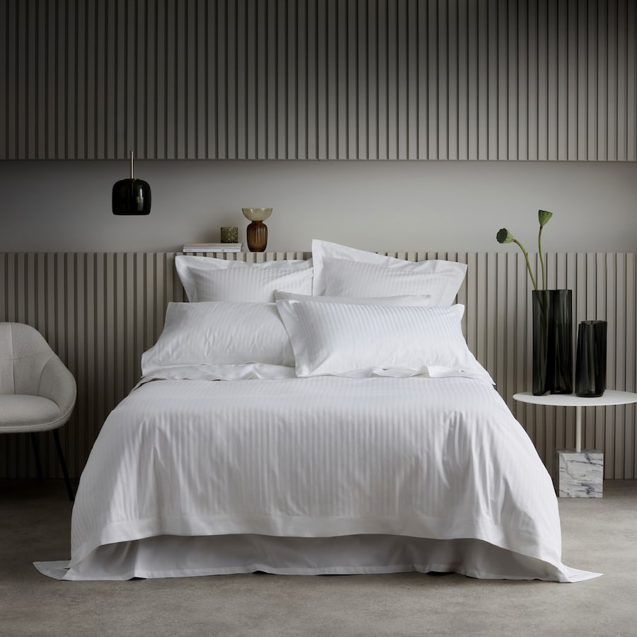 Juego de funda nórdica con un delicado diseño de rayas a tono en hilos mate y satén.