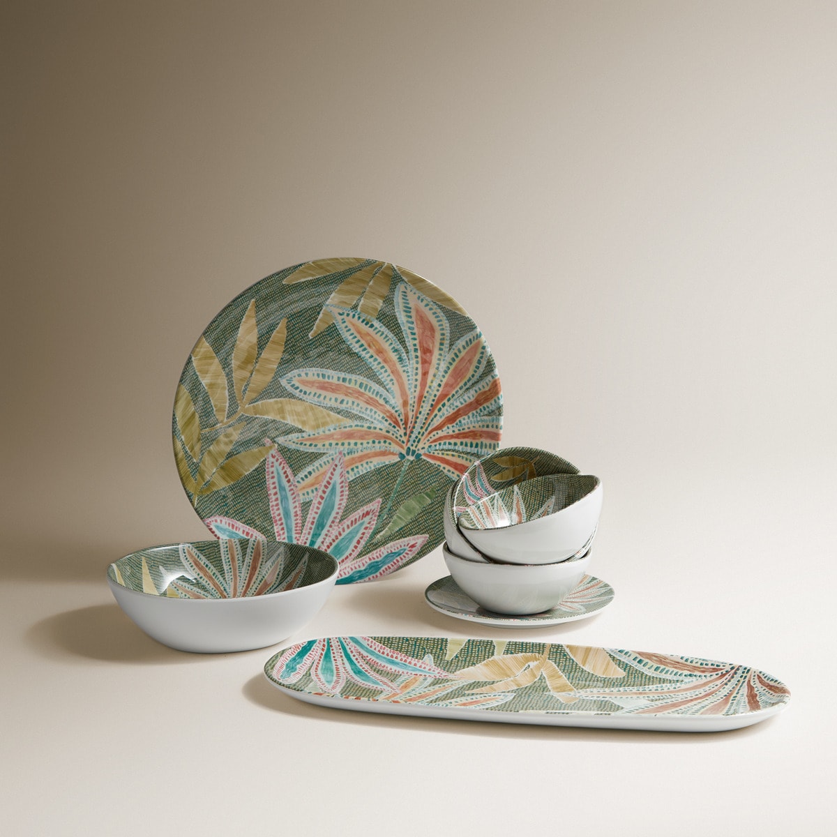 Vajilla por piezas de la colección Bautan, un diseño de inspiración selvática y tropical perfecto para vestir tu mesa con estilo.