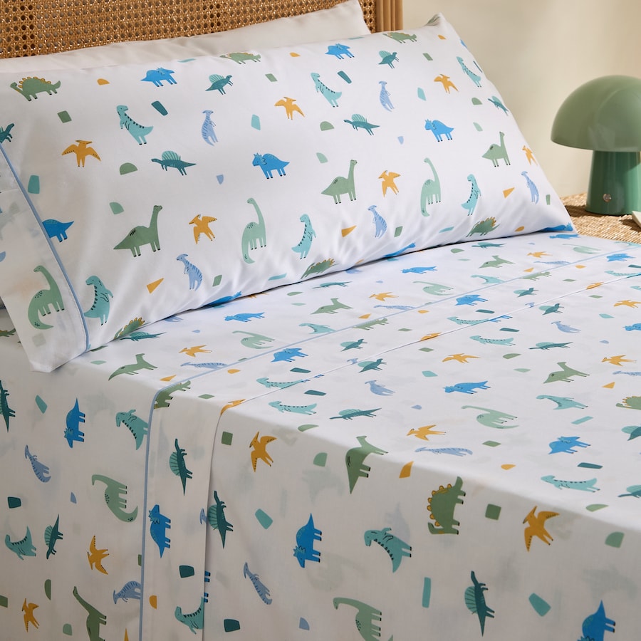 Juego de sábanas con bajera con diseño de dinosaurios.