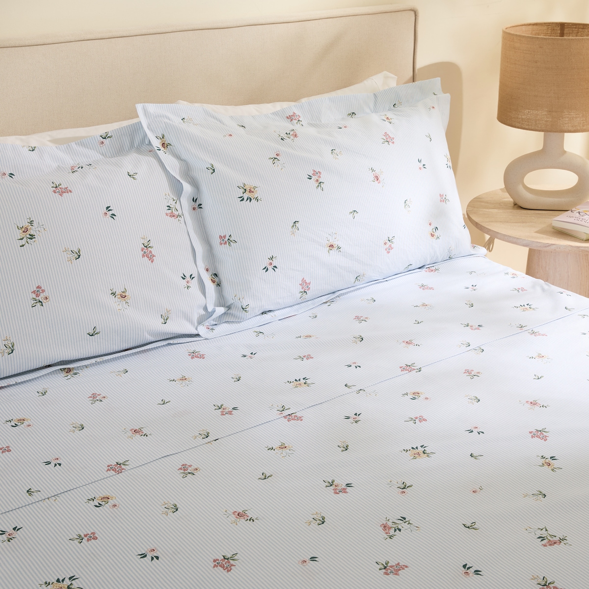 Juego de sábanas con diseño de flores sobre fondo de rayas.