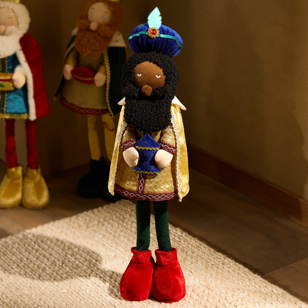 Muñeco infantil del Rey Mago Baltasar. El cuerpo está realizado en material textil de textura suave y en su interior tiene un muelle que hace que al moverlo se mueva como si estuviese bailando.