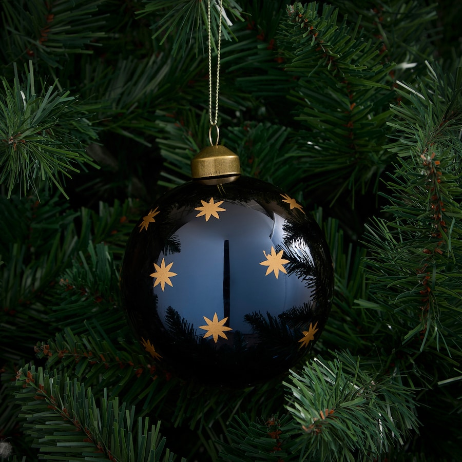 Bola para colocar en tu árbol de Navidad decorada con dibujos de estrelllas doradas, perfecta para conseguir una decoración tradicional y elegante.