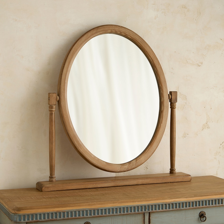 Espejo de madera de la colección Amelia de estilo clásico. Un elegante espejo con marco de madera de pino reciclado y con base para sobreponer en cualquier superficie, como una mesa o tocador. El espejo se puede inclinar para colocarlo en el ángulo que necesites.