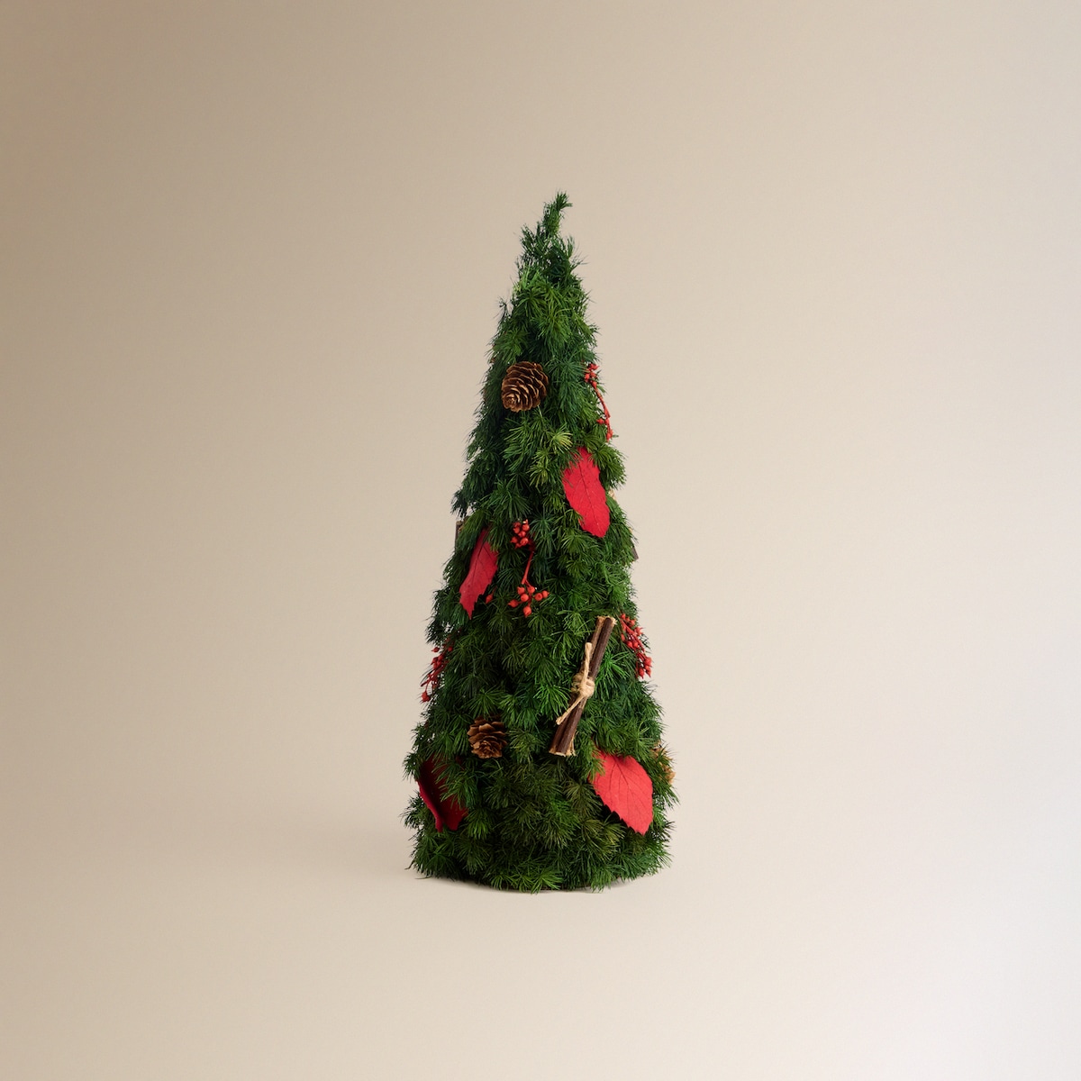 Está decorado con piñas y adornos navideños naturales como hojas de acebo.