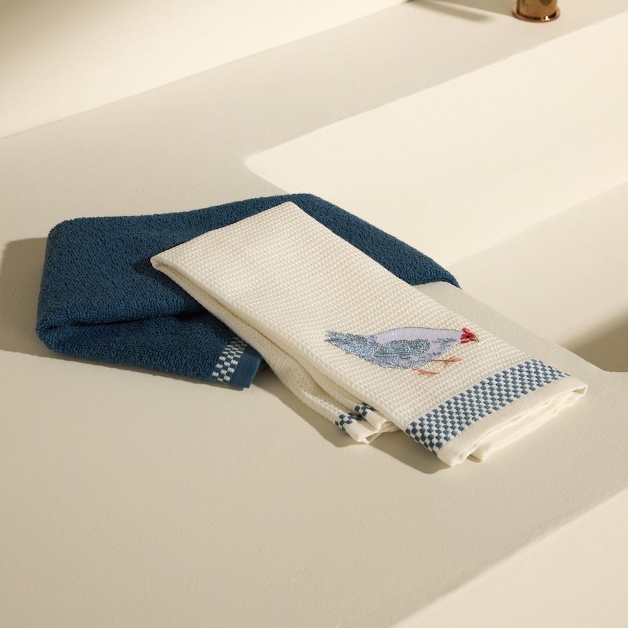 Set de 2 paños de cocina: uno de sarga con bordado de gallina y otro de rizo de diseño liso con cenefa de cuadros.