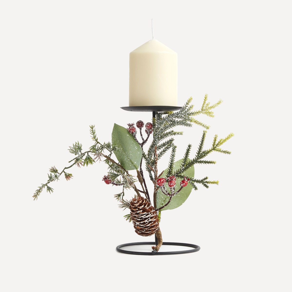 Decora la mesa de Navidad con este centro decorado con hojas de piño y vayas en color verde. Incluye soporte para colocar una vela.