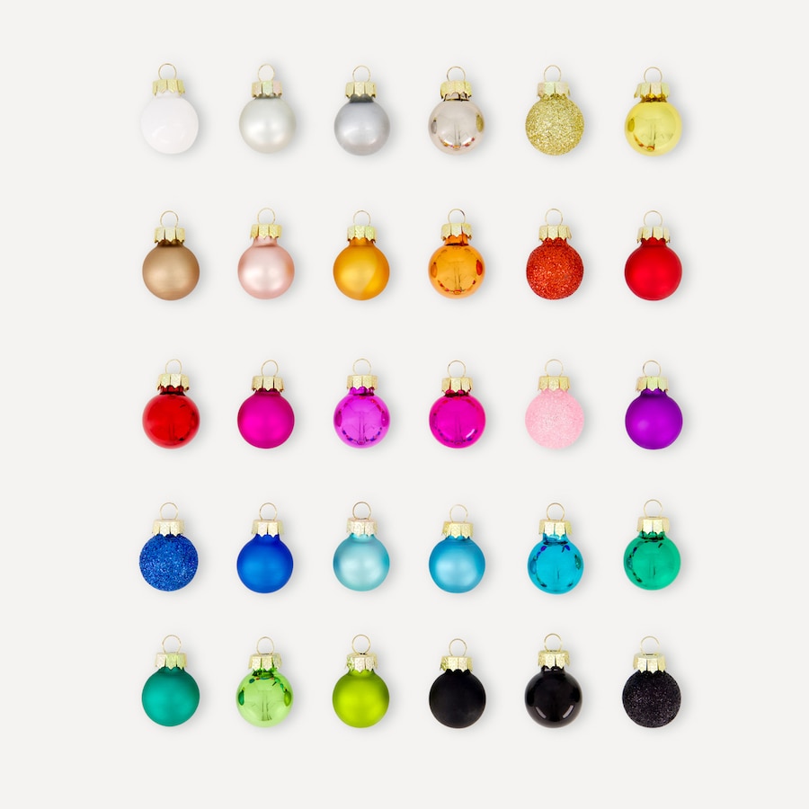 Set compuesto por 100 mini bolas de navidad de 2,5 cm de diámetro cada una fabricadas en cristal. Le darás un aire nuevo, actual y sofisticado a la decoración de tu árbol. Vienen presentadas en una caja para garantizar su mantenimiento y conservación.