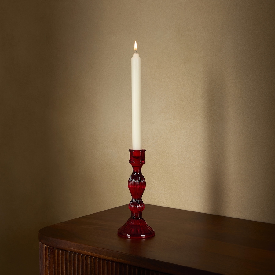 Candelabro fabricado en cristal que destaca por su atractivo y llamativo relieve. De 17,5 cm de alto y disponible en dos colores.
