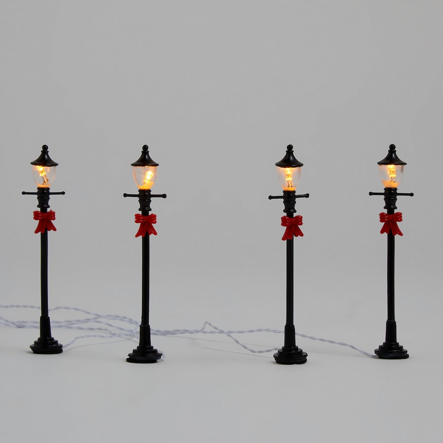 Dale el último toque a tu pueblo americano o Christmas Village con este set de 4 farolas que iluminarán los lugares que prefieras del conjunto. Unas originales farolas que vienen decoradas con un toque navideño gracias a su lazo rojo.