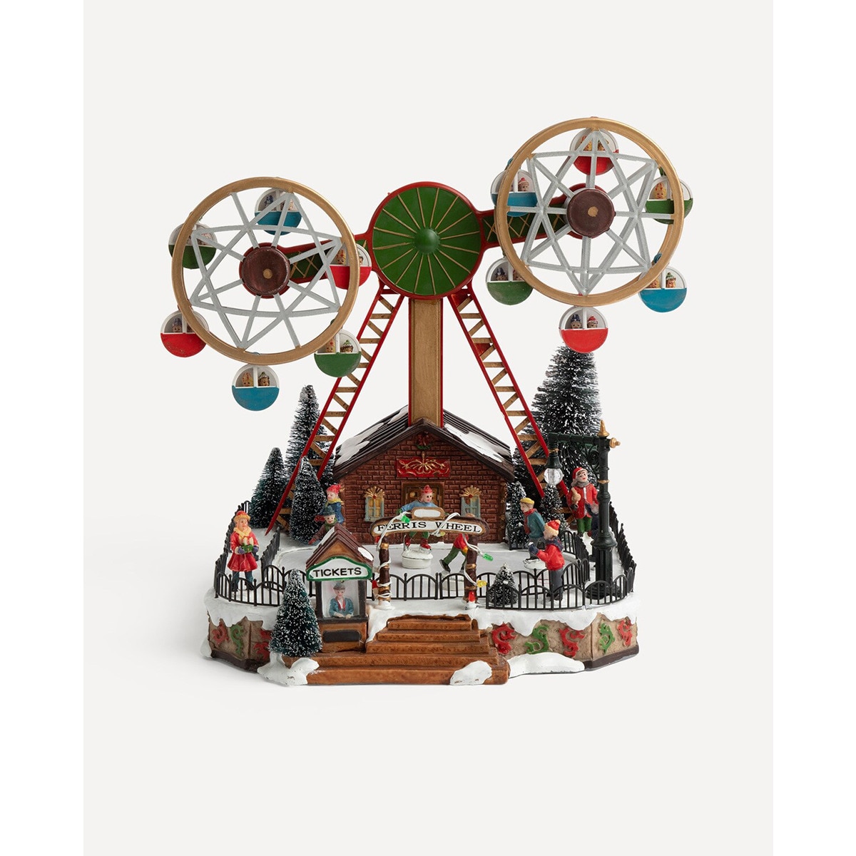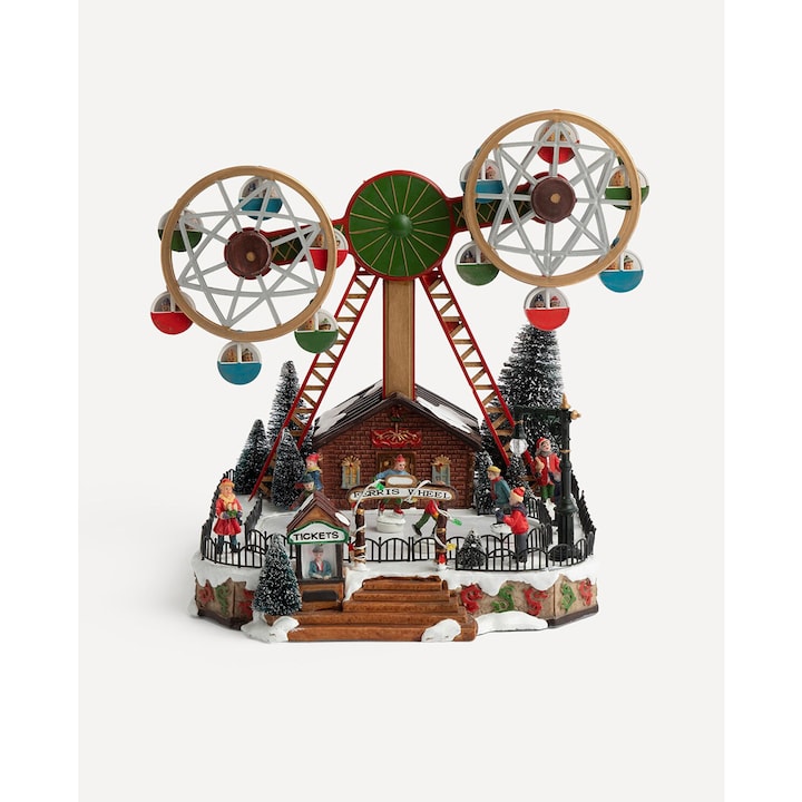 Una escena típica invernal y navideña para completar tu Belén o Pueblo Americano. Esta pieza muestra una pista de patinaje que cuenta con una divertida atracción de fondo. Cuenta con 16 luces LED multicolor que dará un toque llamativo a tu decoración.