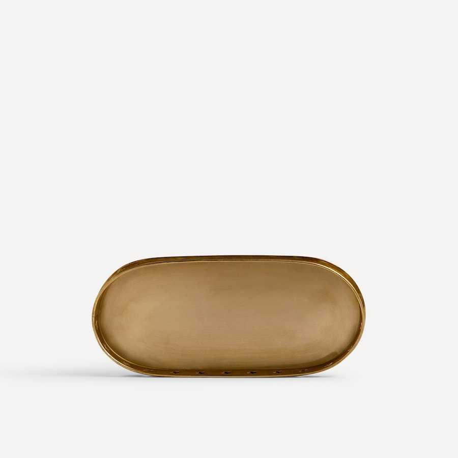Bandeja decorativa de inspiración oriental de forma ovalada y adornada con formas de estrellas. Está fabricada en metal de color dorado, que le da un estilo elegante y festivo.