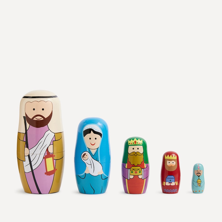 Nacimiento completo inspirado en las famosas muñecas rusas. Cada figura representa una pieza del belén de diferentes tamaños que se introducen en otro de tamaño superior, y así sucesivamente hasta que todas las figuras quedan dentro del más grande.