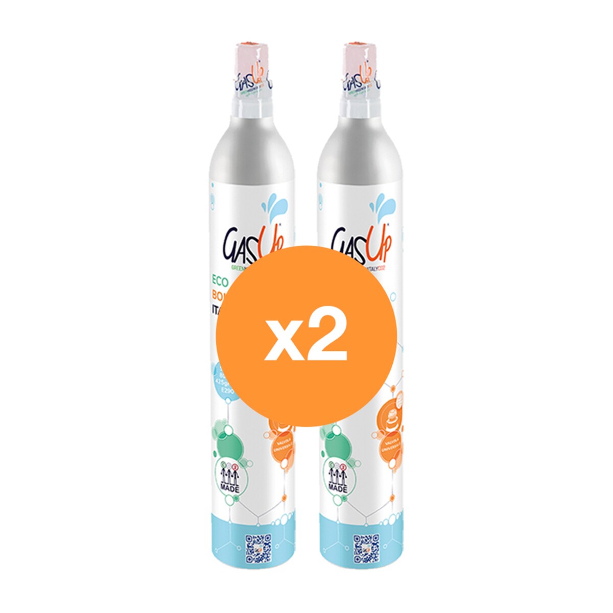 Pack de 2 cilindros 425g de CO2 alimentario. Su función consiste en proporcionar el gas suficiente para carbonatar agua y así poder crear refrescos desde la comodidad del hogar.