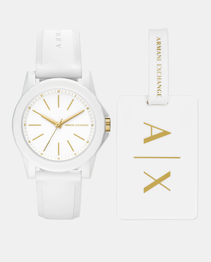 El set de regalo de Armani Exchange incluye un reloj de 40 mm con una esfera blanca mate con índices de varilla en tono dorado, movimiento de tres agujas y correa de silicona blanca con el logotipo grabado; acompañado con una etiqueta para equipaje de silicona blanca con el logotipo en tono dorado.