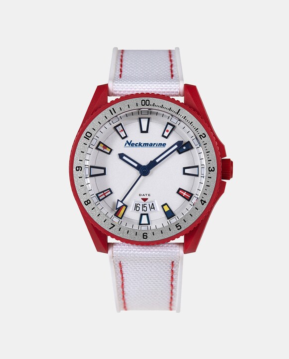 Reloj con caja atornillada de resina, esfera blanca con corona a presión, esfera negra con bisel fijo y brazalete de resina roja con nailon blanco a tono de 20 mm.