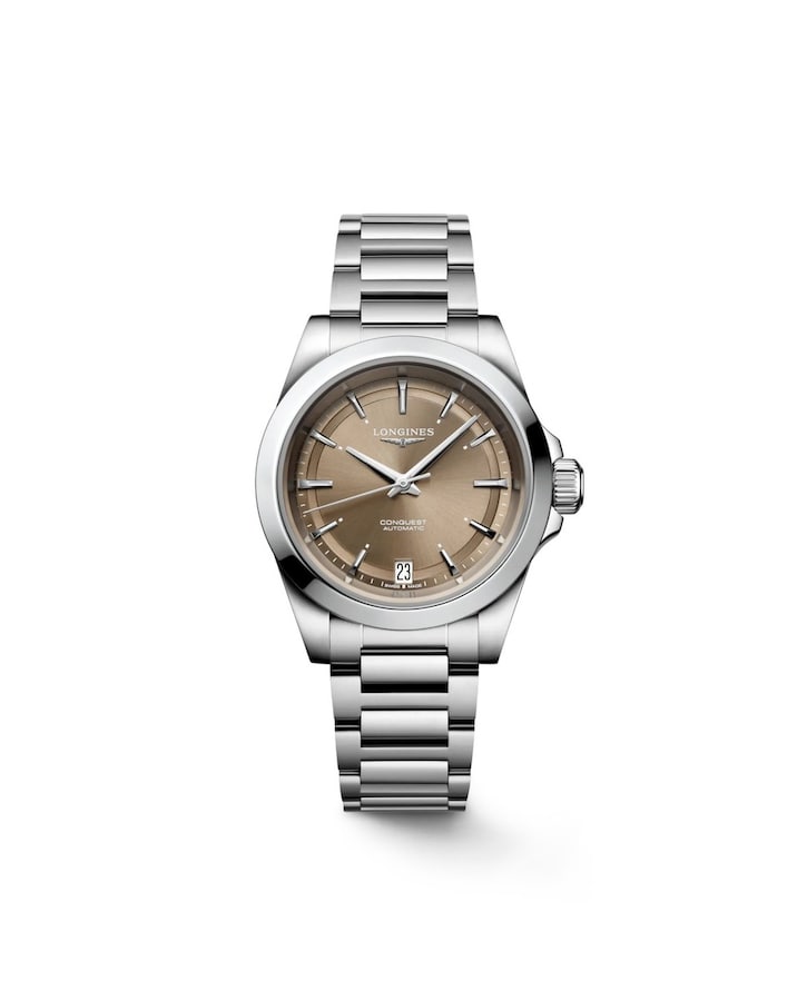 Reloj automático con caja de acero inoxidable, esfera marrón claro y brazalete de acero inoxidable.