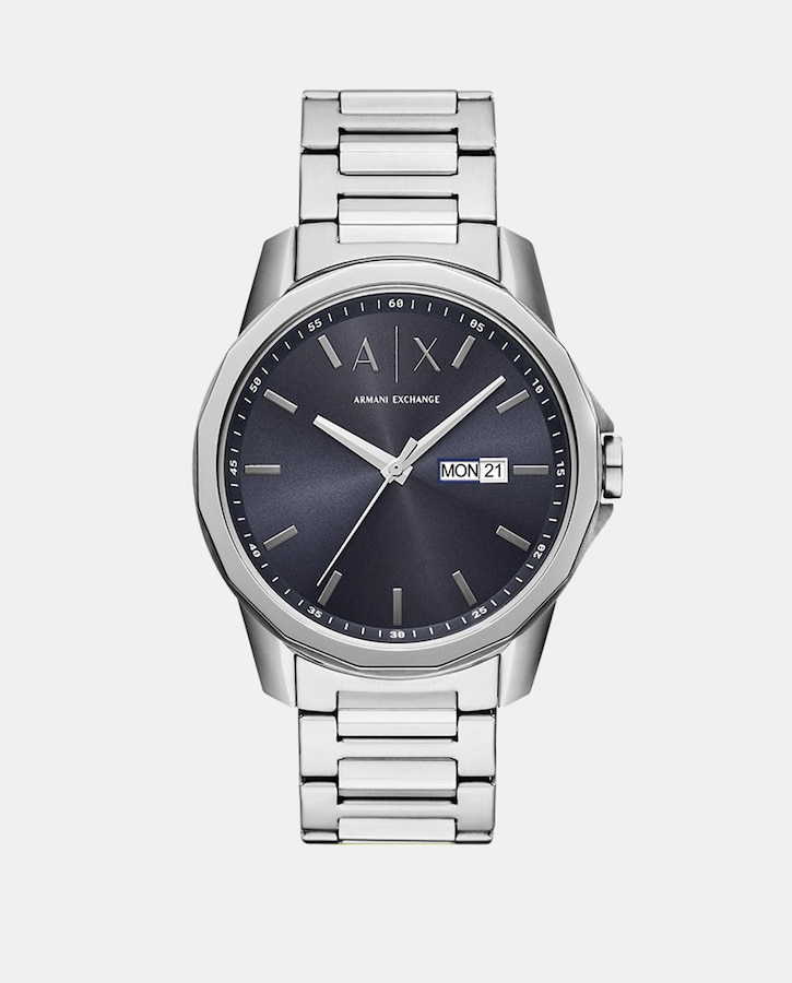 Reloj hombre Armani Exchange de cuarzo tres manecillas con caja de acero inoxidable, esfera azul con tres manecillas y fecha. Brazalete de eslabones en H de acero inoxidable.