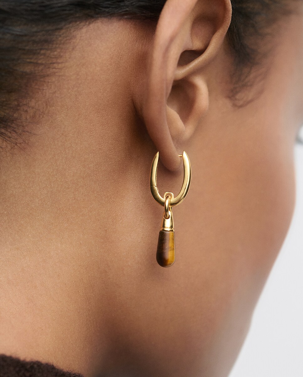 Pendiente individual de aro en plata de ley 925 miésimas (100% reciclada) con acabado baño de oro de 18 quilates y piedra ojo de tigre.