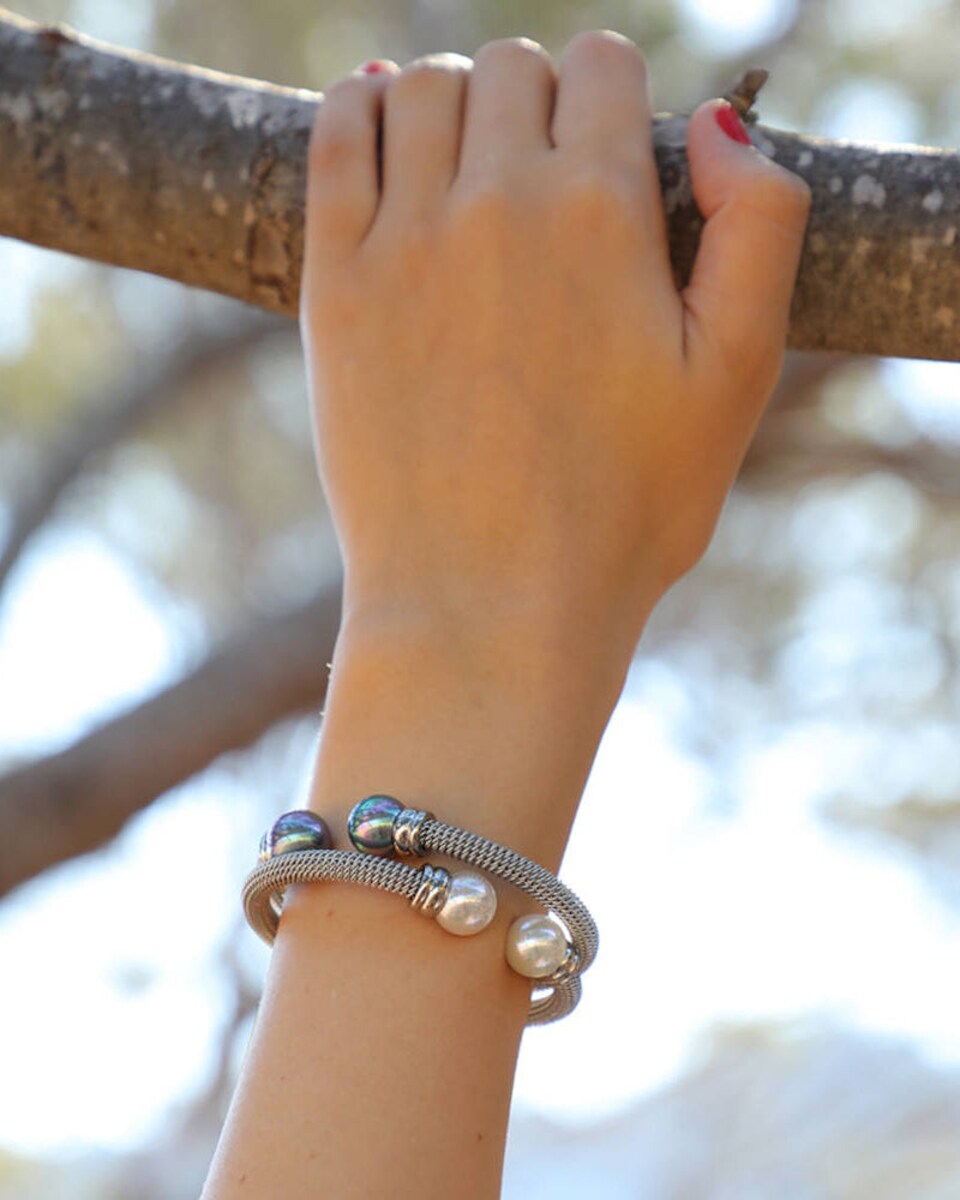Pulsera Tender de acero con perlas grises de 12mm