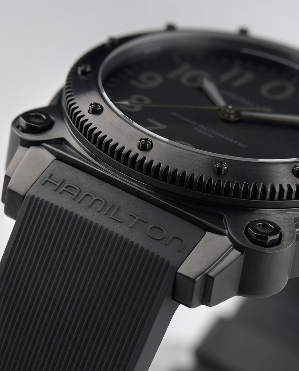 La nueva caja de titanio añade durabilidad y ligereza al reloj Khaki Navy BeLOWZERO de alto rendimiento. Con una resistencia al agua de 100 bares (1000 m) y equipado con una válvula de escape de helio, este reloj de inspiración submarina es perfecto para su próxima aventura acuática. La impresionante caja de titanio de 46 mm con revestimiento de PVD negro es la encarnación del estilo furtivo y cuenta con una máscara de buceo especial grabada en relieve en el fondo.