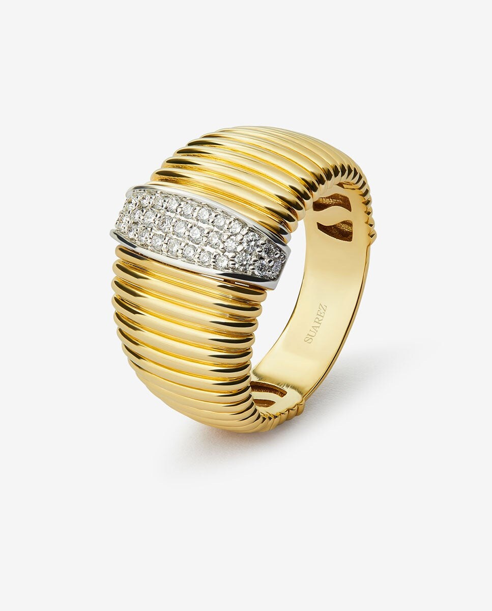 Anillo gallonado de oro blanco y amarillo de 18K con pavé de diamantes en talla brillante