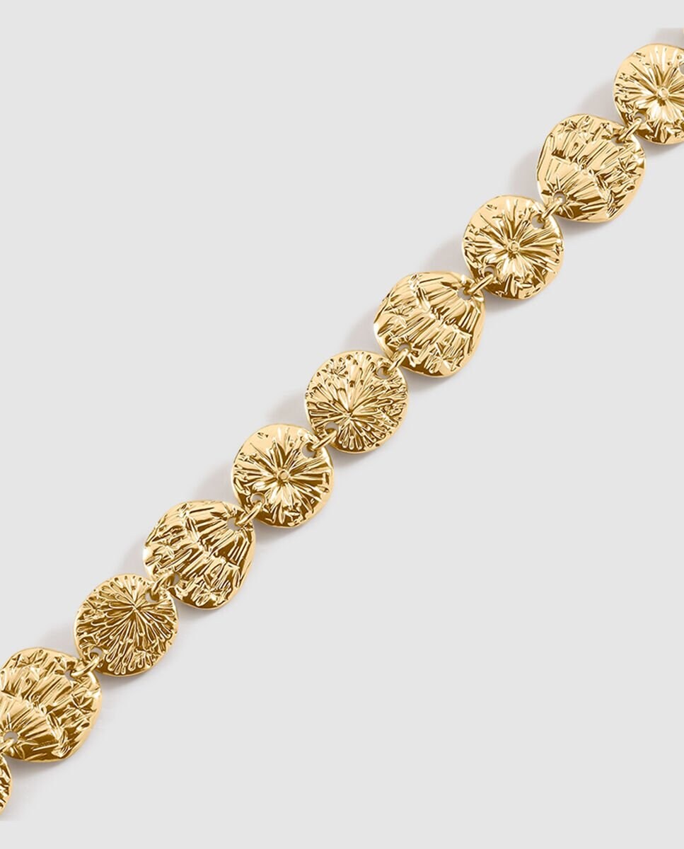 Pulsera acabada en oro con medallas irregulares. Llevan un grabado súper original que imita los rayos del sol. Una pulsera para ponerte y no quitarte. Original, cómoda y tendencia, ¿Quién da más?
