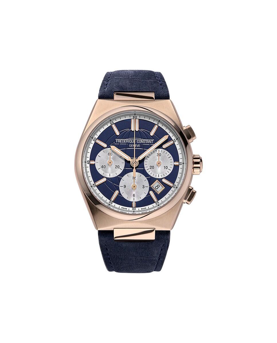 Elegante Reloj de hombre de la marca suiza Frederique Constant, colección Highlife Chronograph Automatic. Con movimiento de automático FC-391 (Base LJPL110). Caja en acero inoxidable 316L y en color oro rosa de 41 de diámetro. Cristal de zafiro convexo antirreflectante. Esfera color azul. Funciones Horas, Minutos, Segundos, Fecha a las 4, Cronógrafo mecánico. Correa de Piel de nobuk con estampado de cocodrilo y en color azul.