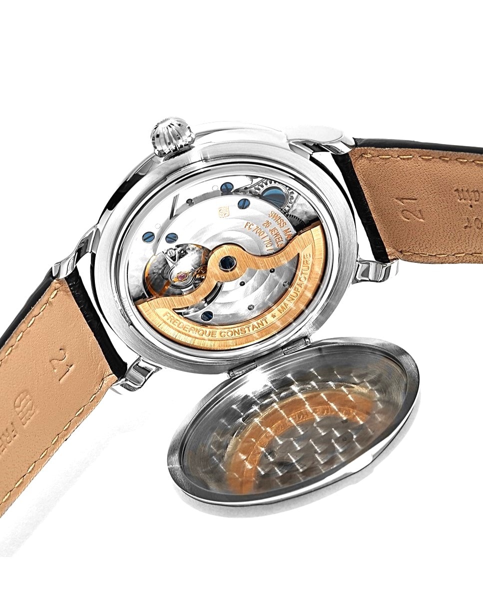 Elegante Reloj de Hombre de la marca suiza Frederique Constant, colección Manufacture Classic Moonphase. Con movimiento de manufacture FC-715. Caja en acero inoxidable 316L y en color acero de 40.50 de diámetro. Cristal de zafiro convexo antirreflectante. Esfera color plata. Funciones Horas, Minutos, Fase lunar, Fecha manual. Correa de Piel de cocodrilo y en color negro.