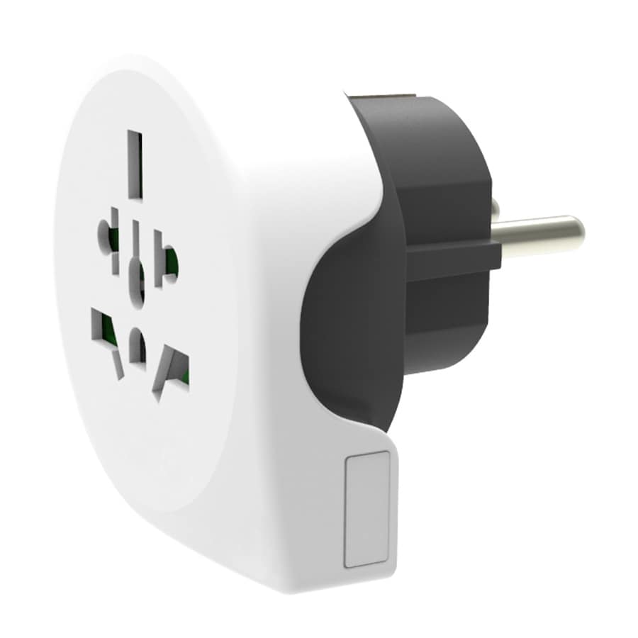 Adaptador de viaje con 7 tipos de clavijas diferentes para poder utilizar tus aparatos eléctricos en Europa, vengas de donde vengas.