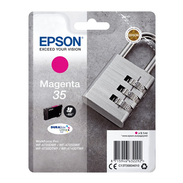 El cartucho de tinta Epson 35 DURABrite Ultra Ink en color magenta es una opción ideal para quienes buscan imprimir documentos de alta calidad y durabilidad. Este cartucho está diseñado para ofrecer resultados profesionales, siendo resistente al agua, las manchas y los rotuladores, lo que garantiza que tus impresiones mantendrán su aspecto impecable a lo largo del tiempo. Gracias a sus propiedades de secado rápido, es perfecto para la impresión a doble cara, facilitando un flujo de trabajo eficiente. Este cartucho es compatible con varias impresoras de la serie WorkForce Pro, incluyendo los modelos WF-4720DWF, WF-4725DWF, WF-4730DTWF y WF-4740DTWF. Con una capacidad de 16.1 ml, permite un volumen de impresión aproximado de 650 páginas, basado en una cobertura del 5% en tamaño A4. Incluye un cartucho estándar, asegurando que tengas todo lo necesario para comenzar a imprimir.