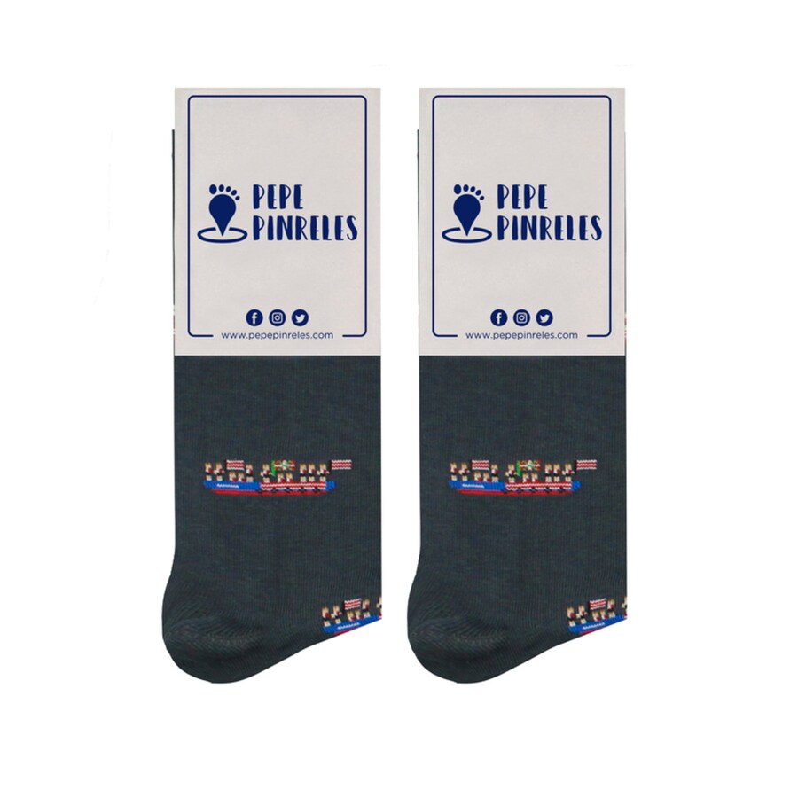 Calcetines Pepe Pinreles Gabarra. Calcetines de algodón de Gabarra, una de las celebraciones de títulos más características es la que realiza el Athletic Club en las míticas gabarras por la ría de Bilbao. Composición: 80% Algodón, 17% Poliamida, 3% Elastano. Presentan un diseño que incluye motivos relacionados con el Athletic Club.