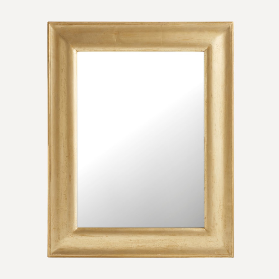 Espejo de de pared con marco de madera de mango con acabado en oro envejecido. La moldura es curva.