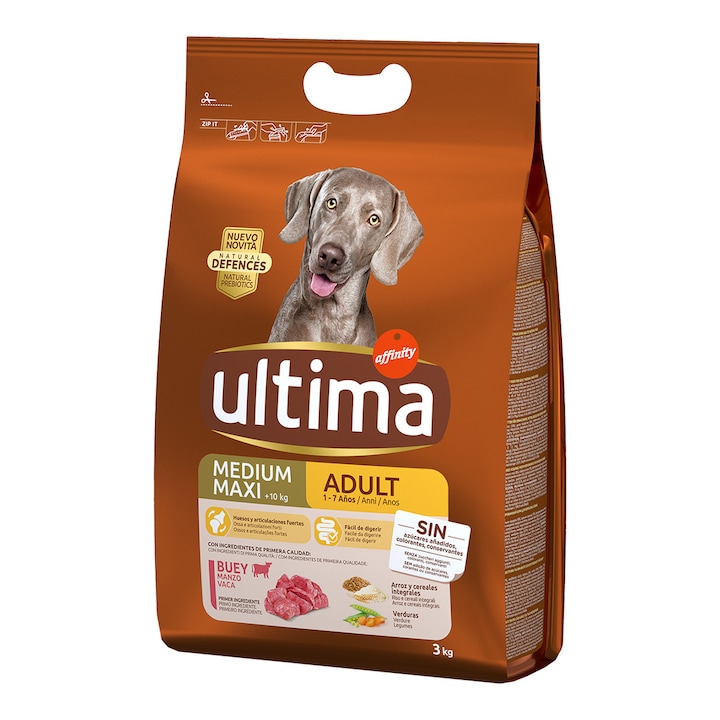 El pienso para perros medianos y grandes Ultima Medium-Maxi Buey es un alimento seco de alta nutrición, diseñado específicamente para perros adultos que pesan más de 10 kg. Este producto se caracteriza por su fórmula avanzada que incluye carbohidratos de lenta absorción, lo que ayuda a mantener a tu mascota en óptima condición física mientras disfruta de cada comida. El buey es el primer ingrediente, proporcionando proteínas de alta calidad que contribuyen a mantener la masa muscular. Además, su composición incluye arroz, cereales integrales y pulpa de remolacha, favoreciendo una digestión óptima gracias a su efecto prebiótico. Las raciones diarias recomendadas varían según el peso del perro, siendo más bajas debido a la alta calidad nutricional del alimento. Se sugiere adaptar las cantidades a la condición corporal, nivel de actividad y condiciones climáticas del animal, complementando con ejercicio diario para un bienestar integral.