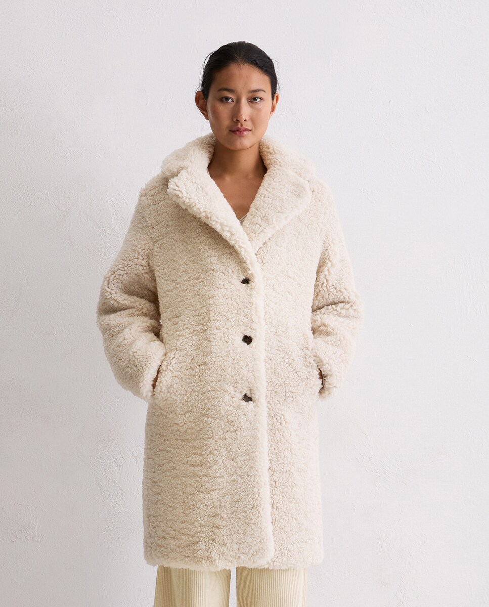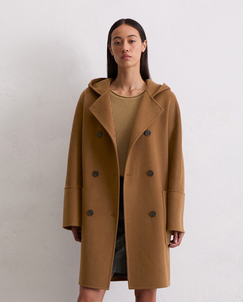 Abrigo de mujer con capucha fabricado con una mezcla de lana de doble cara