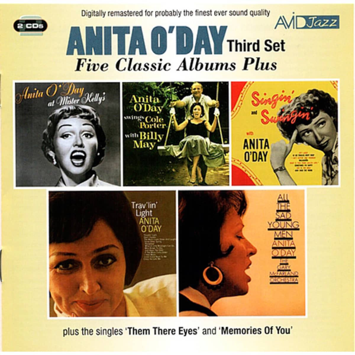 Cinco álbumes remasterizados presentados en un asequible formato de doble CD y conteniendo los textos que aparecieron en los álbumes originales. Encontraremos a Anita O'Day acompañada por diferentes formaciones que van desde el trío de piano, contrabajo y batería presente en At Mister Kelly's, álbum de 1958, hasta la big band. También tenemos la sorpresa de uno de los primerísimos trabajos en solitario de la artista, que venía de los combos de Gene Krupa y Stan Kenton. Nos referimos a Singin' And Swingin', procedente de 1947 y grabado en el sello Coral. Cinco deliciosas joyas, pues, de la llamada Jezabel del Jazz.