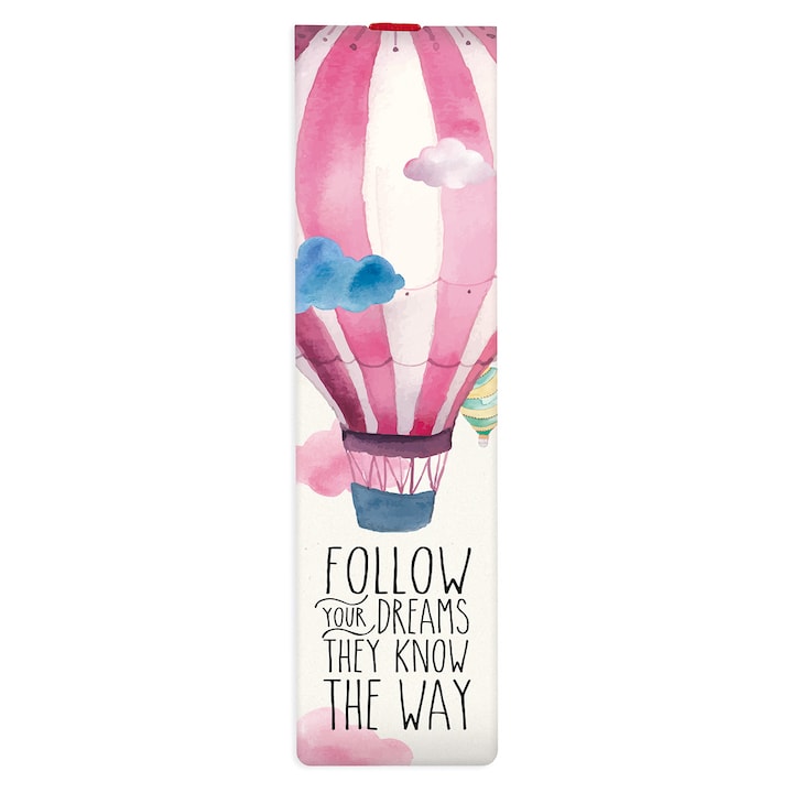 Marcalibros con goma elástica con mensaje follow your dreams.